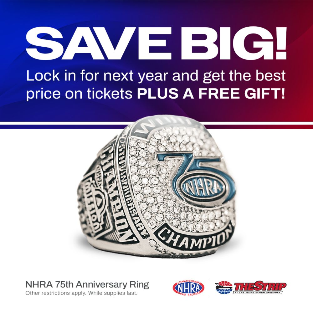 Renew your tickets for 2026 while at the track this weekend to receive your very own limited additional NHRA 75th Anniversary ring! Save on your tickets for next season, lock in your same great seats and camping and receive a gift! You can renew at the main Ticket Office located near the Gift Shop, the Upgrade Booth under the main grandstands in section 1N, at the Trackside Box Office in the campground, or you can renew online through account manager below.
