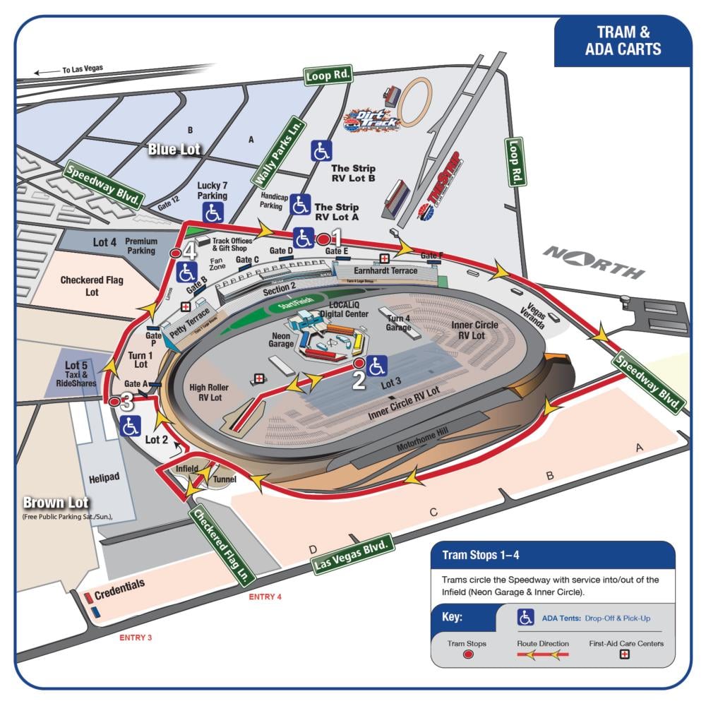 Fans can hop on a tram for easy access around LVMS. Trams circle the Speedway with service into and out of the Infield (Neon Garage & Inner Circle).