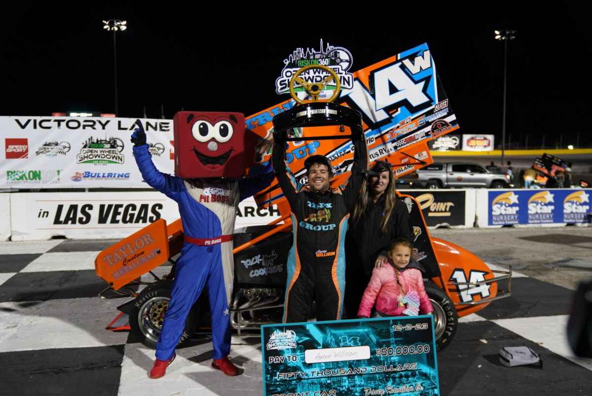 Aaron Willison of Langley, British Columbia, Canada led wire-to-wire for the richest payday in pavement open wheel history, a $50,000 USD or $67,480 Canadian haul, after the 100-lap Riskon360! Open Wheel Showdown for Winged Sprint Cars at the Bullring at Las Vegas Motor Speedway.