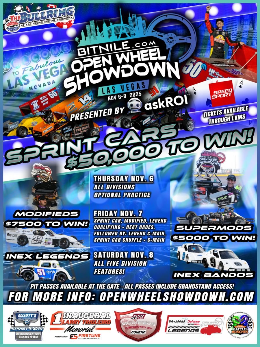 The richest asphalt short track event in the world returns on November 6-8 to the Bullring at Las Vegas Motor Speedway with the BITNILE.com Open Wheel Showdown, presented by askROI. Nearly 250 teams will compete across five different divisions, including the $50,000 to win Elliott’s Custom Trailer & Carts Winged Sprint Cars with 71 entries.
