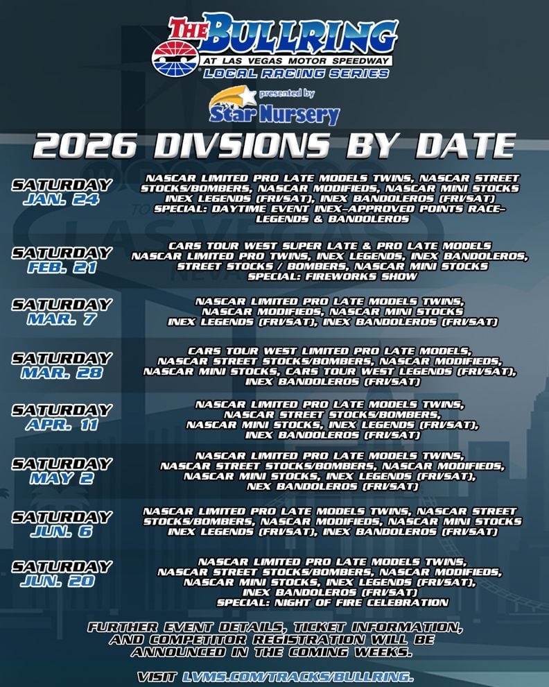 “The Bullring Local Racing Series presented by Star Nursery represents the heartbeat of grassroots racing in Las Vegas, and our goal is to elevate both the competition and the overall fan experience in 2026,” said Tim Huddleston, Co-Owner of KHTH, LLC. “With Joey Mancari, Pat Petrie, and Kevin Terrell joining our leadership team, we’re confident we have the right structure in place to deliver a professional, competitive, and consistent racing product.”